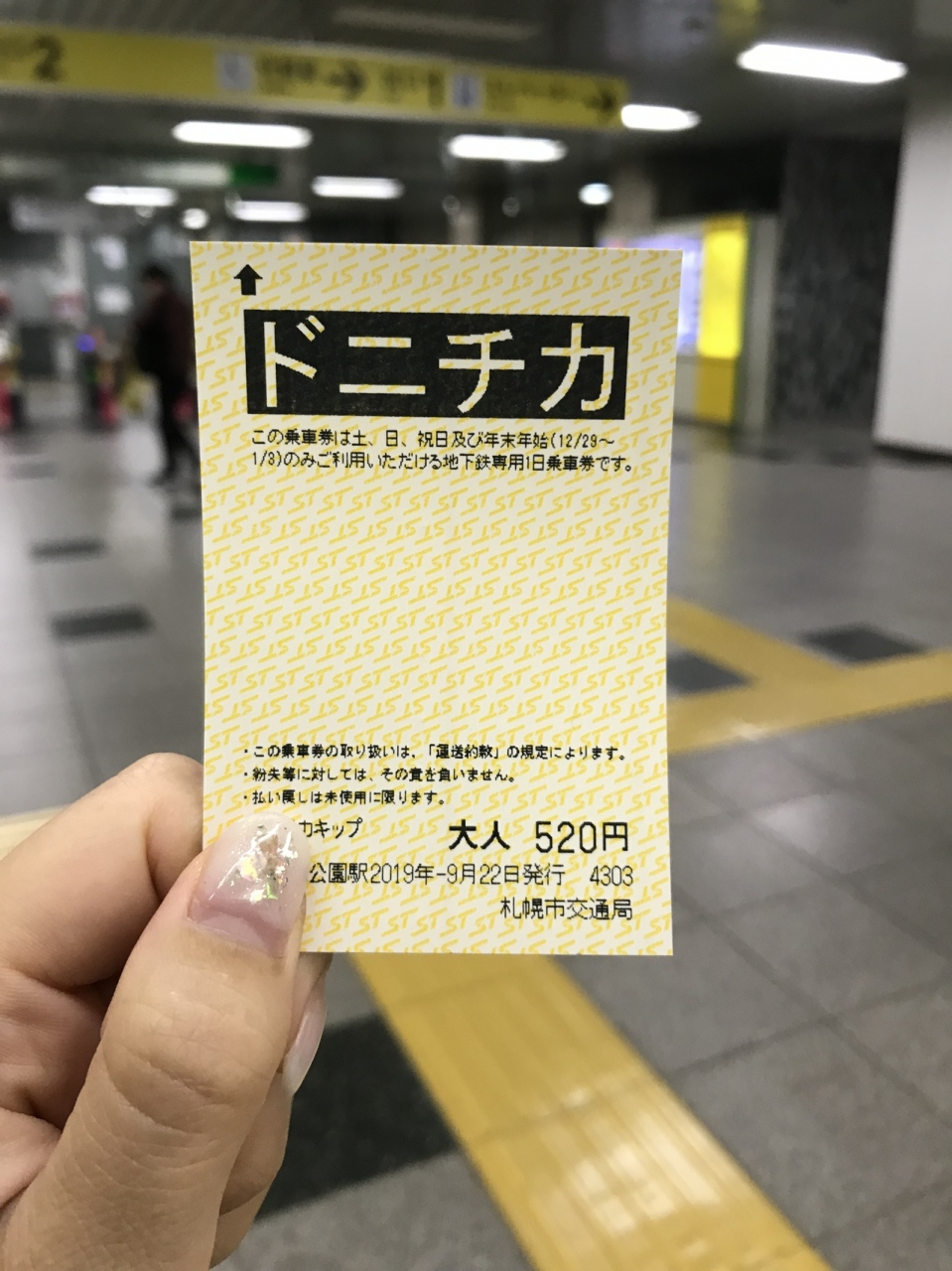 札幌市内を地下鉄利用するなら、週末に限ってはドニチカがおすすめ。地下鉄はどことも料金が高いイメージですが、ドニチカだと520円で終日乗り放題。乗車する距離にもよると思うけれど、3回ほど乗れば元が取れると思われます。