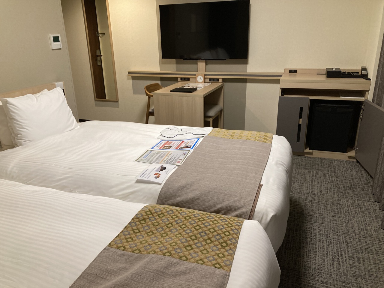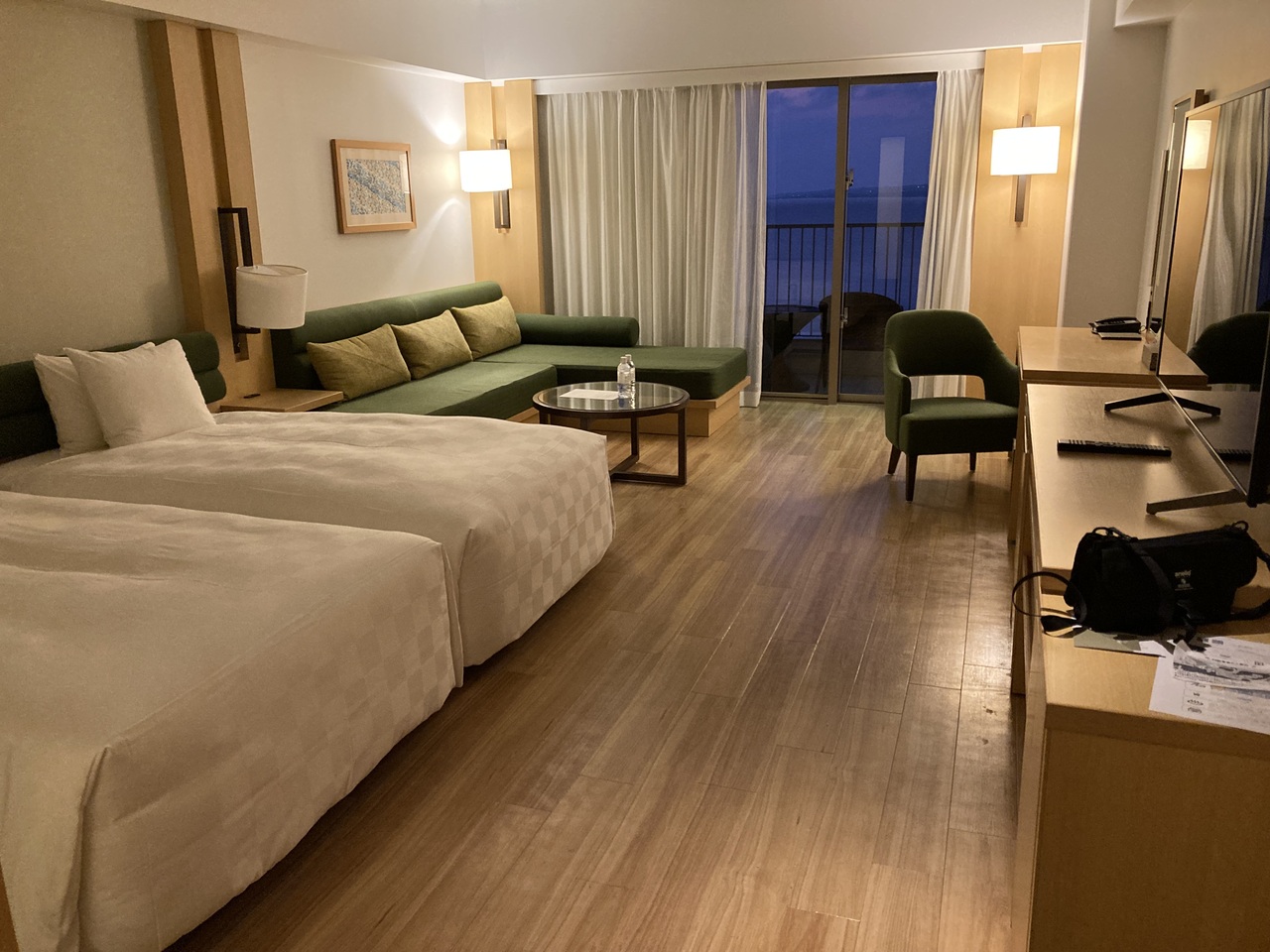 ツインに大きなソファーがあって(3人の時のエキストラベッドだと思いますが)案外使いやすい部屋でした 大きなスーツケースを広げる程度のスペースもあります クローゼットが無く、壁にハンガーをかけるタイプは不便でした 地方はチャンネルが少ないですが、ネットフリックスなどの有料チャンネルがあって