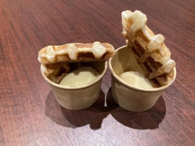 1階の朝食会場で部屋番号を告げて、どちらか一つをもらいますが アイスクリームが人気で数分で無くなるそうです