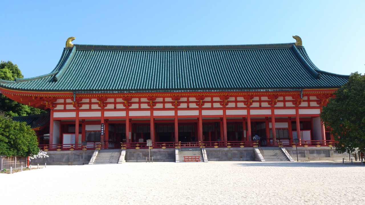 赤と緑を基調とした鮮やかな色彩の建物と、地面に敷き詰められた白砂のコントラストが目に眩しい。