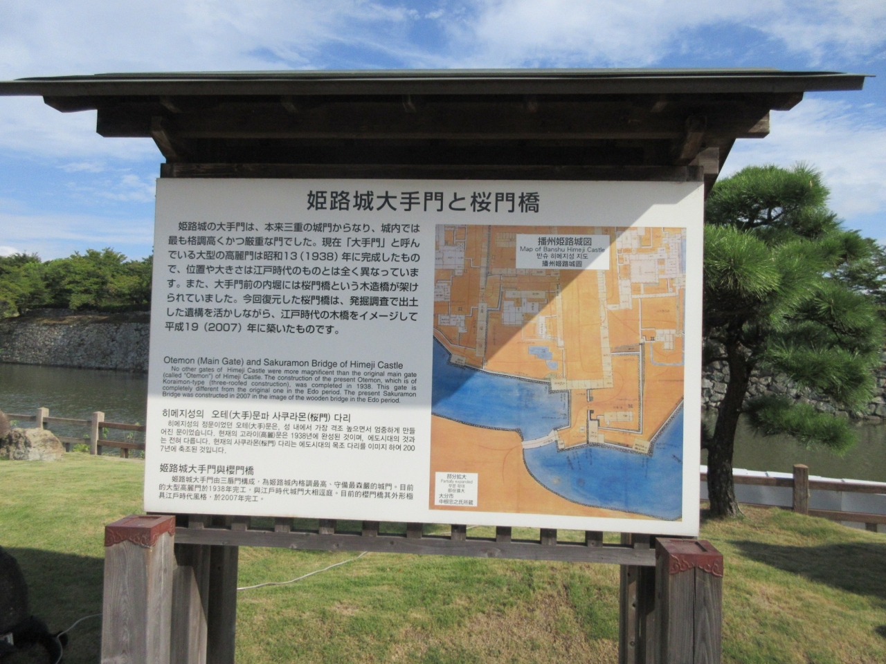 姫路駅から姫路城に向かって真っ直ぐ歩いてくると,この大手門に出ます.立派な門で,お堀には桜門橋という橋が架かっていて,遠景に姫路城の天守が入るので,殆どの観光客がここで記念撮影をしていました.ただ,説明文によると,大手門自体が昭和13年に建てられたもので,本来姫路城にあった大手門とは場所も形も全く違うのだそうです.