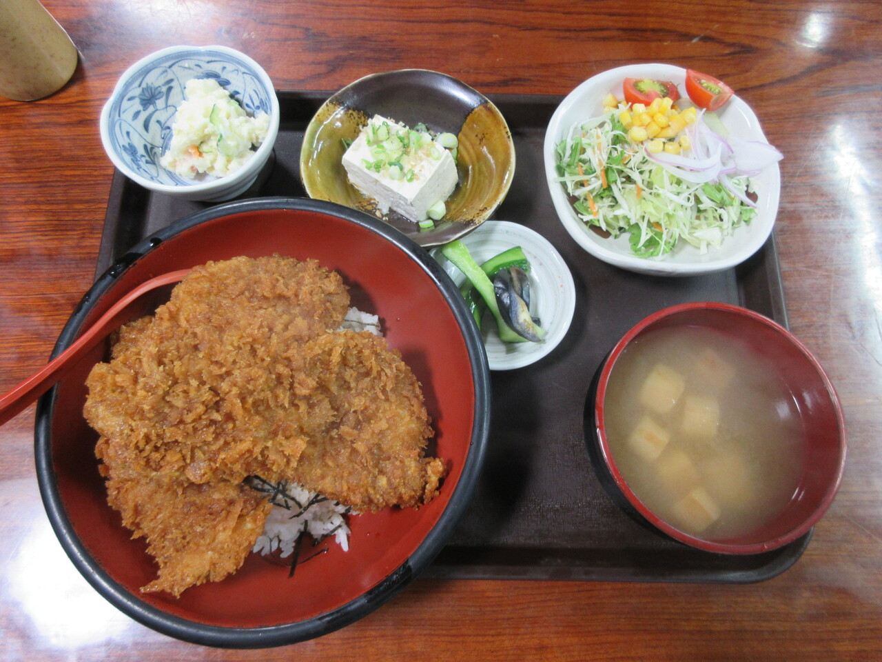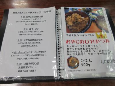 入口にラーメンの看板が出ていましたが、メインはヒレカツ丼のようでした。ヒレカツの大きさによっておやじ、せがれなど、独特の名前がついていました。ヒレカツ丼は小鉢も付いてボリューム満点なので、コスパはかなり良いと思います。店内には熊の剥製など、独特の飾りつけがしてあって、チョッと?という感じもしますが、味は悪くないと思います。お腹が空いているときにはお勧めのお店です。