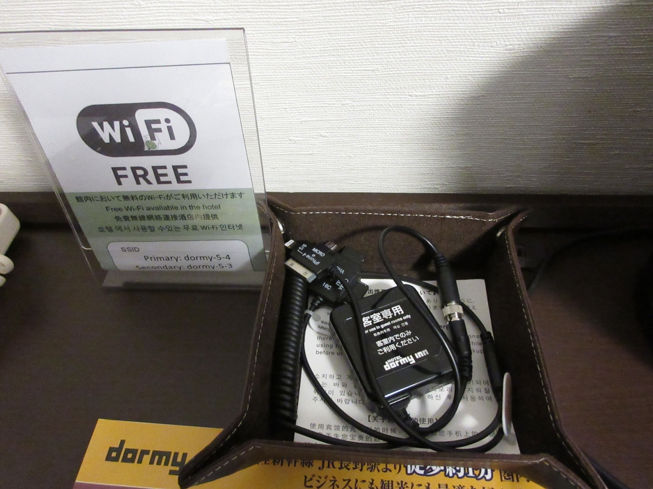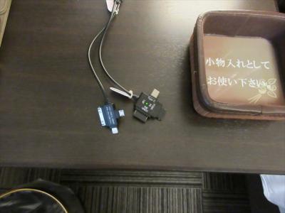 スマホ用の各種充電用コネクタ.iPhone用もありました.タオルは質の高いタオルが準備してありました.飲み物はお茶パックが2つあるだけです.
