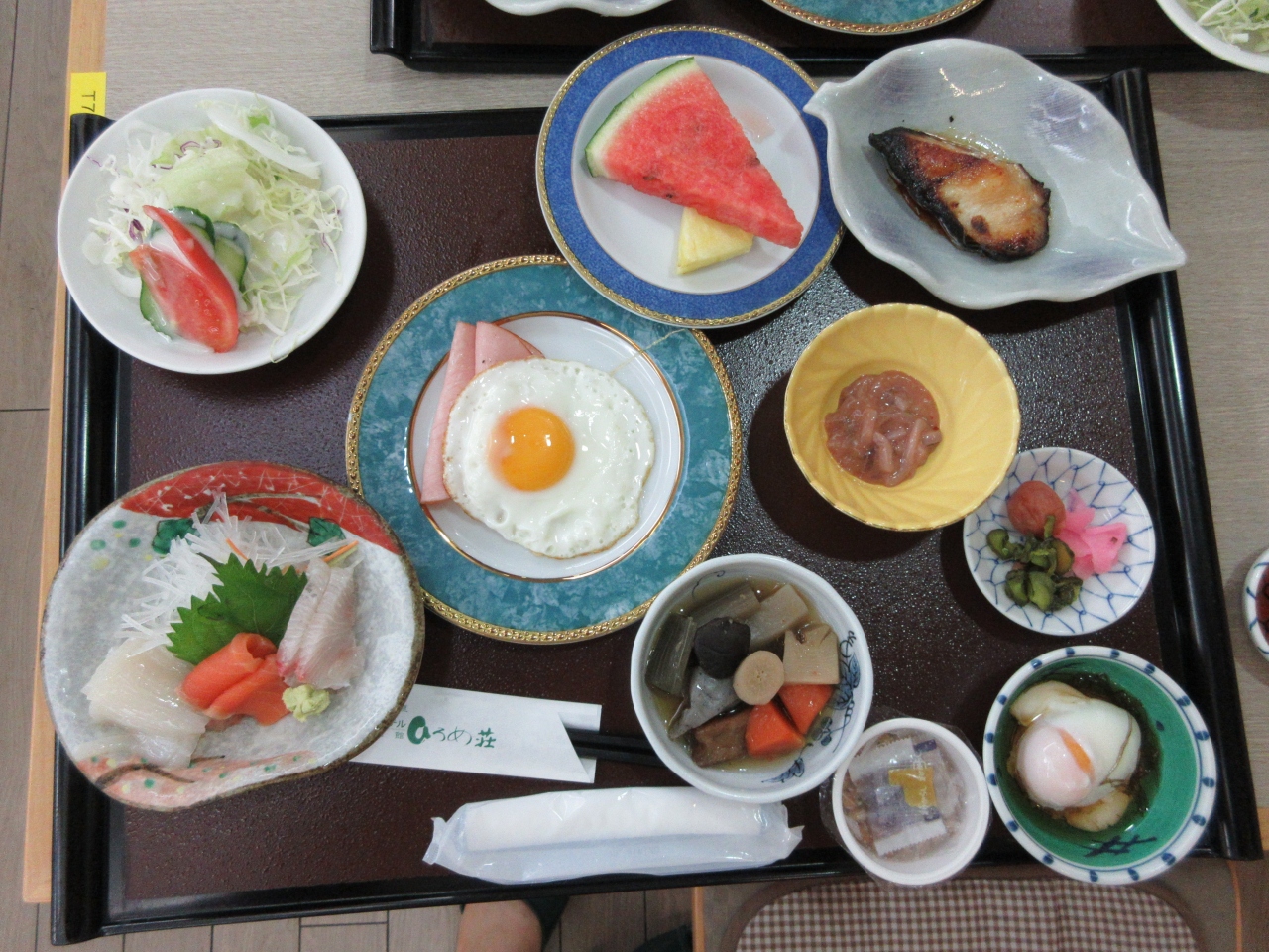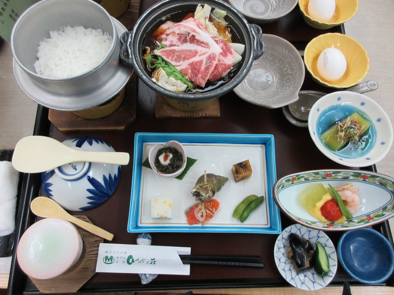 夕食はしゃぶしゃぶなど8品程度.もう少し地元色を出せないのかなと思いました.朝食は「バイキング(烏賊食べ放題)」となっており期待していましたが,宿泊客が少なかったためお膳の朝食となりました.品数は沢山ありましたが,残念ながら前の日の夕食で食べたのと同じ物がいくつかあり,「残り物かな?」と思わされる内容でした.