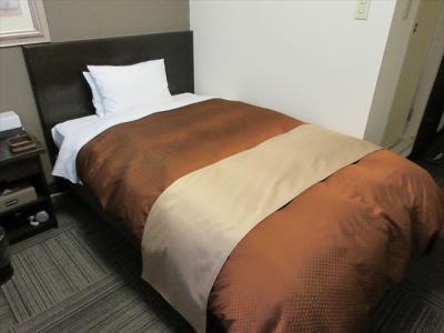 禁煙シングル12m2.ベッドはそれなりの広さです.エアコンは1℃単位で調節できるので便利です.