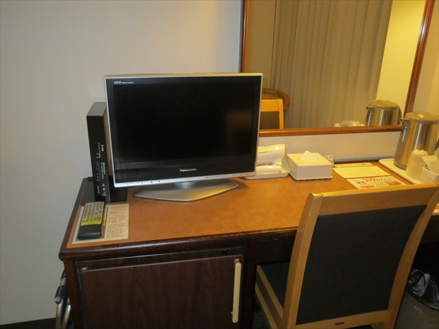デスクの上には電気ポット,ヘアドライヤー,TVが乗っています.机が小さいので片付けないと利用がチョット大変ですが,マァ何とか仕事はできそうです.椅子はキャスター無しです.