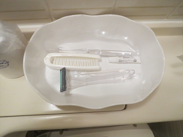 コンディショナー,シャンプー,ボディソープ,歯ブラシ,櫛,髭剃り.歯ブラシの品質は余り良くないです.この他にフロントで入浴剤をもらえます.