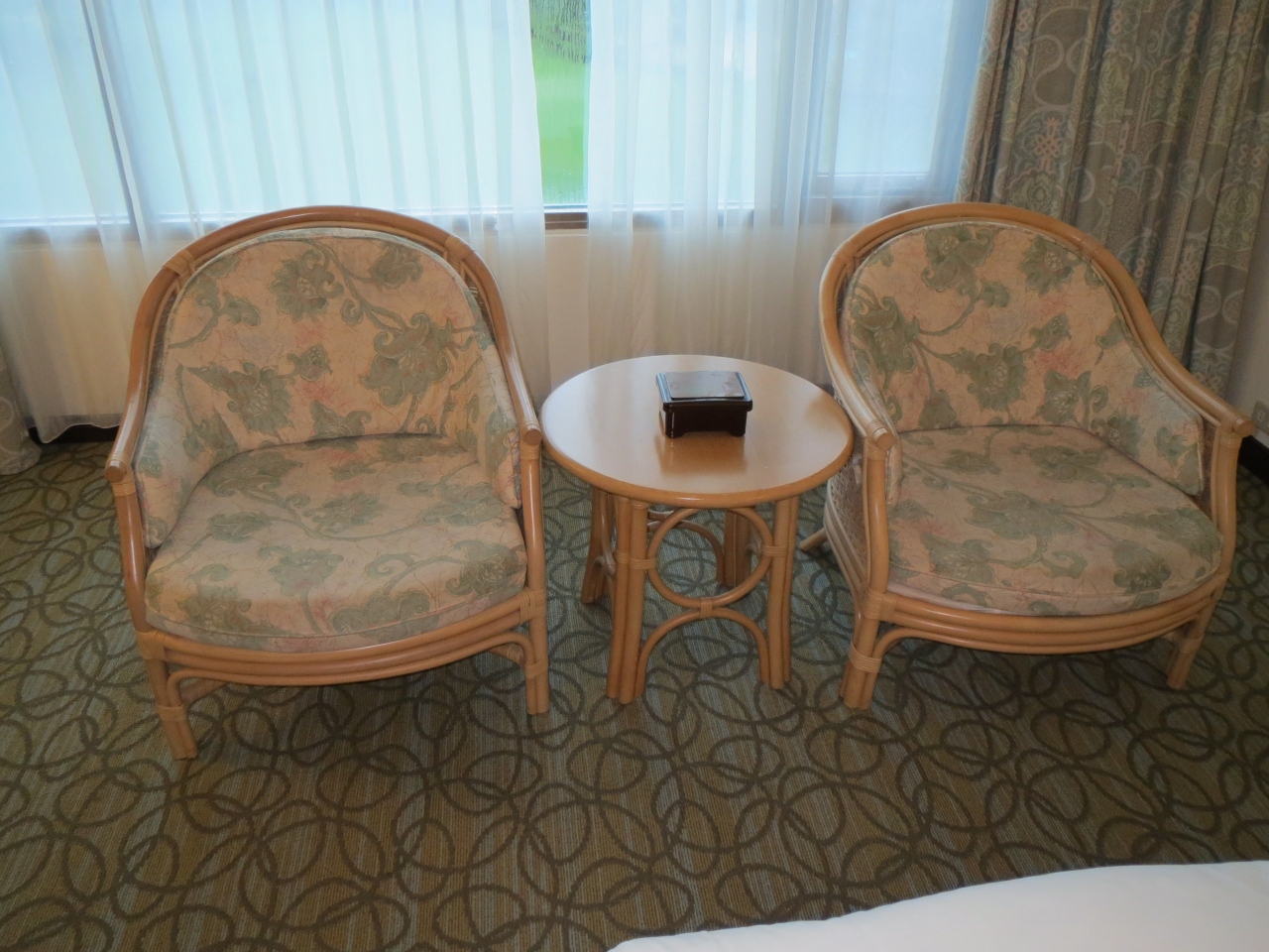 鏡台と兼用のデスク.椅子に背もたれがないため,仕事をするには不便です.部屋の隅には椅子2脚と小さいテーブルが置いてありますが,背が低いのでここでPCを広げて仕事をするのはもっと大変.