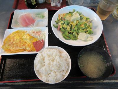 夜間にも開店している食堂を探してここを見つけました.注文は自販機でチケットを購入して渡すシステムです.注文したゴーヤ定食は,ゴーヤチャンプルーの他にお刺身(3切れ),卵焼き,みそ汁,ご飯が付いて780円と割安感があります.味はごく普通です.その他に,オリオンの生ビール(発泡酒)が200円と,合計でも1000円未満でした.夜遅いがコンビニはどうもという方にはお勧めです.