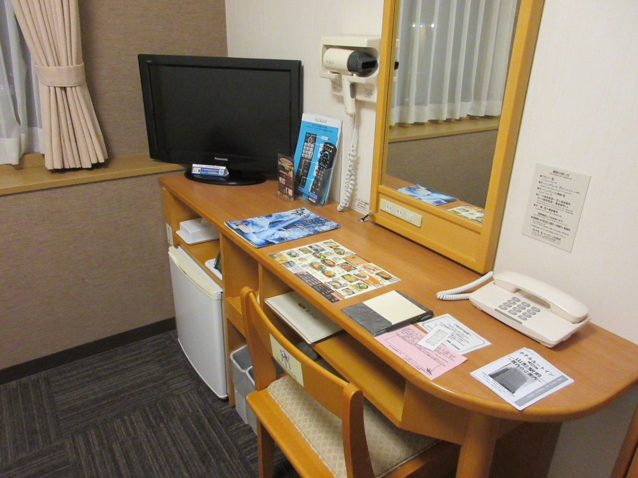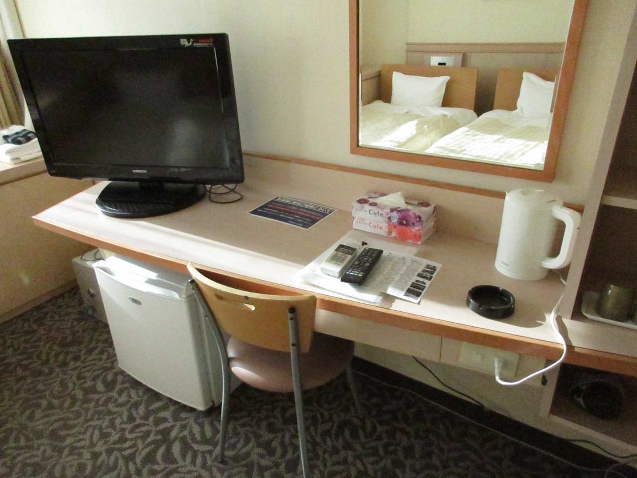テレビは日立WOOの26インチくらいのものが置いてありました.デスクは狭く,椅子はキャスター付きで動くので,仕事はし難かったです.エアコンが集中管理方式だったのも少し残念な部分です.