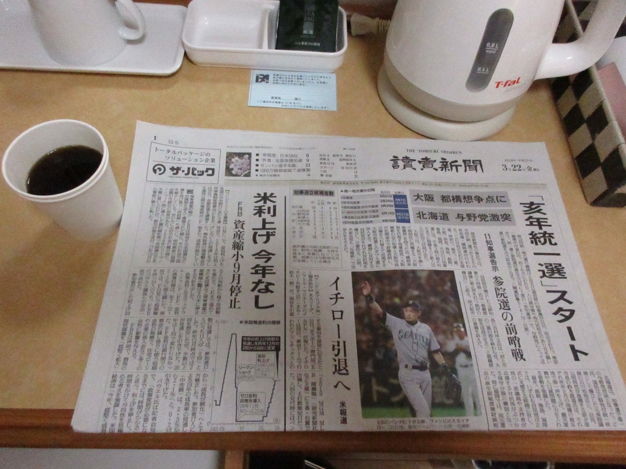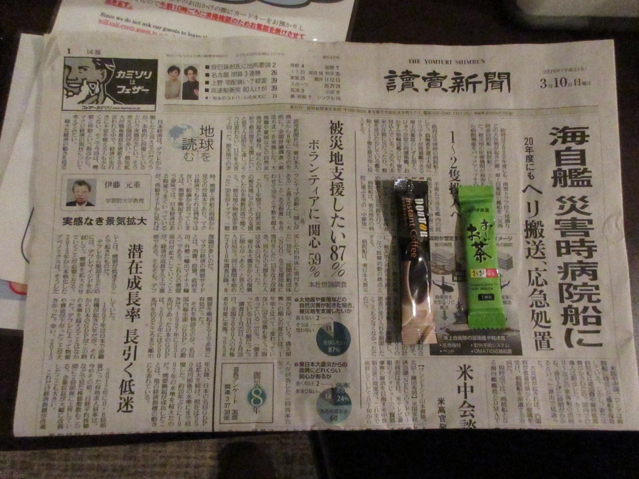 フロントで無料コーヒーやお茶が貰えますが,どちらもインスタントで,ちょっと残念でした.また,読売新聞の無料配布があります.