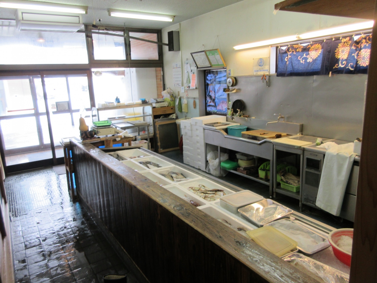 にかほ駅から徒歩10分いない,商店街の一角にありますが,外目からだとレストランということが良く判らず,一見すると普通の魚屋に見えます.食堂利用の人は,魚屋の脇から和室に入ると,かなり細長い食堂スペースがあります.基本的に畳敷きの部屋です.