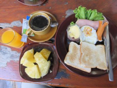 朝食は1Fのカフェですが,いわゆるB&B形式で,無料で付いてくるのは,トースト,ゆで卵,ミニサラダ,コーヒーです.コーヒーはジュースなどと変更も可能です.また,お金を追加すれば,ホットドッグなど,朝食メニューをグレードアップできます.