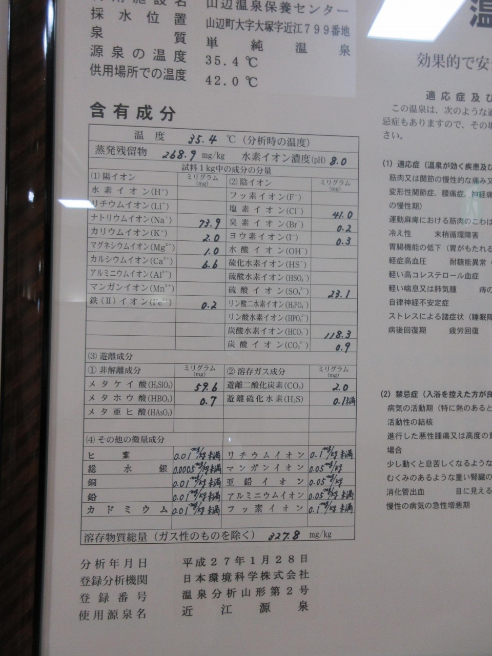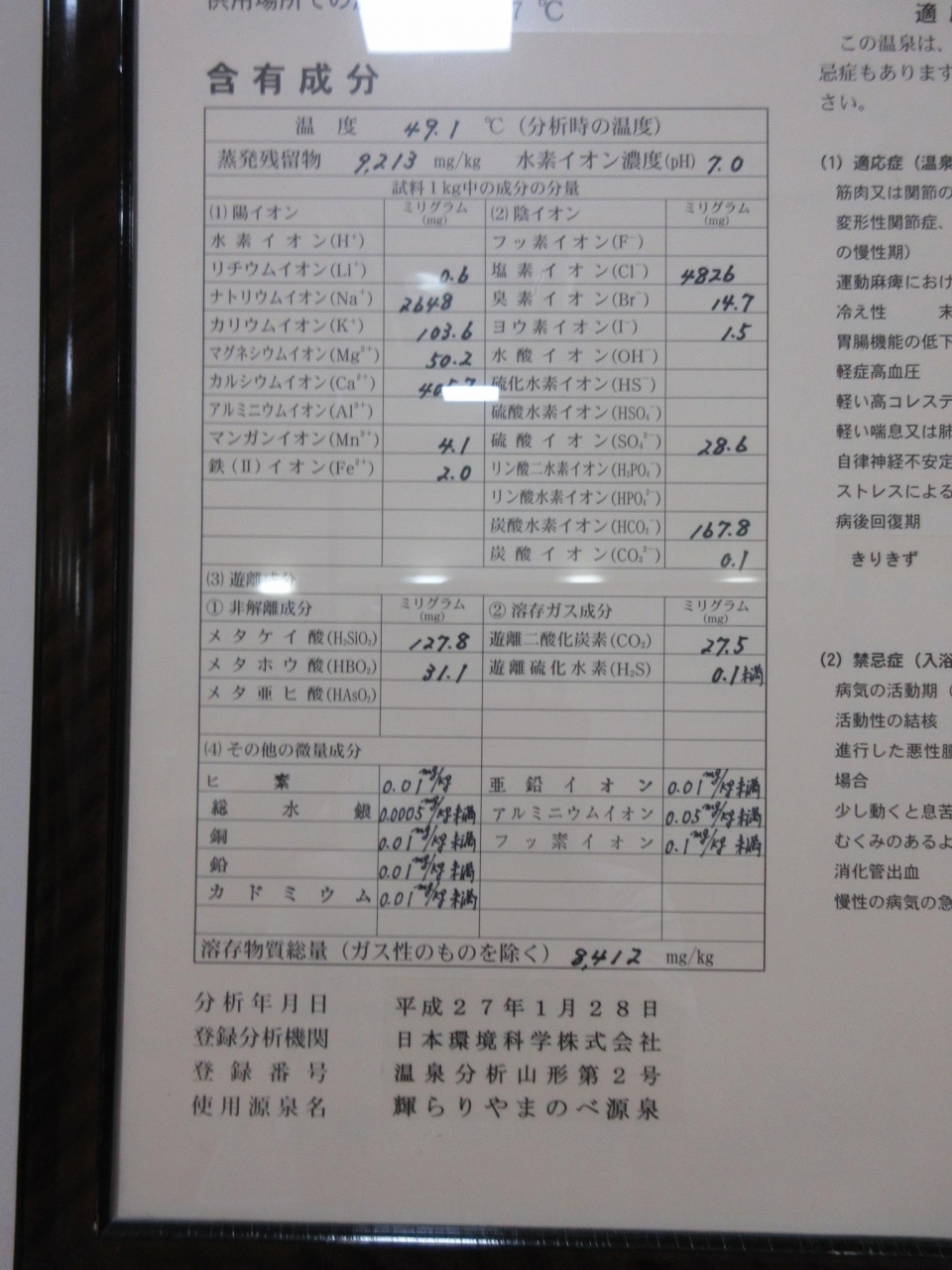 山辺町と山形市の境付近にある日帰り温泉施設です.大浴場,サウナ,打たせ湯などが揃っており,泉質は濁りのある高温泉です.温泉成分表によれば,源泉は2種類有り,一つが温度49.1℃,pH7.0,溶存物質8412mg/kg,もう一つが35.4℃,pH8.0,328mg/kgのようです.アルカリ性の美人の湯でお湯も少し濁りがあり,効能がありそうな温泉でした.産直施設も併設しています.- 旅行時期