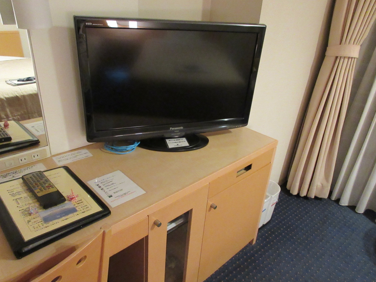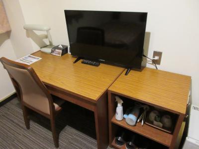 ・デスク:椅子はキャスター無しで使いやすいです.机の上にはTVが載っているので,チョット邪魔ですが,PCを広げて仕事をするスペースは十分にあります.