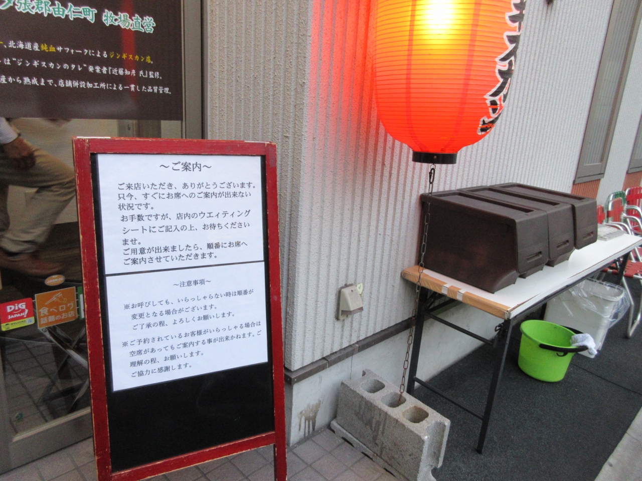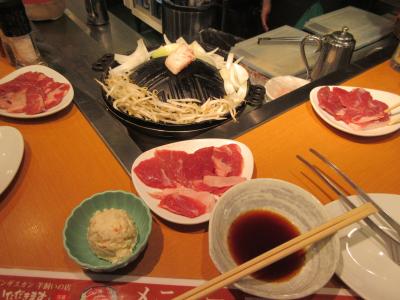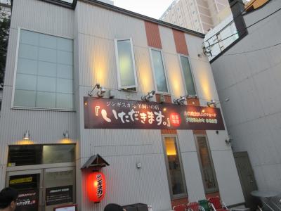 ・「さっぽろでジンギスカンと言えば先ずここ」と教えて貰ったので,午後5時の開店15分前に行きましたが,平日で既に10人程度並んでいました.プレハブのような建物で,「松田つり具」という看板の方がはるかに大きく見えます.メニューはほぼジンギスカン(900円)なので,「おかわり」と言えば,お皿に肉を盛って出してくれます.その他に野菜やキムチのメニューもありましたが・・・.この日は着席と同時に満席で,後から来た人は,椅子の後ろに置いてある長いすなどで気長に順番を待っていました.流石有名店だけあって肉に臭みは全くなく,美味しく食べられました.お肉2皿,ビール2杯,キムチで3,500円くらいでした.なお,「本店」という名前ですが,このお店自体の「支店」は出していないようでした.- 旅行時期