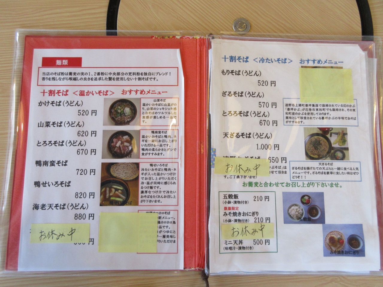 ・十割蕎麦を謳っているので,その中でこの価格は安いと思います.ただ,量的には少なく,手打ち感がありませんでした.山菜蕎麦も内容的にはちょっと残念(缶詰の輸入物のような感じ).なお,冷たいお蕎麦は山葵ではなく,東和町で栽培している暮坪カブを使っているそうです.道の駅の中にあるので,時間がない時には良いかも知れません.- 旅行時期