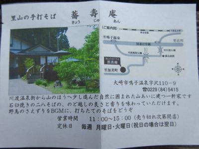 ・鳴子温泉の隣りの川渡温泉から,県道267号線を1 kmくらい入ったところにあります.周囲に人家はなく,静かなところです.またお店の中にはジャズが流れていてお洒落です.人気のお蕎麦屋さんらしく,県外からも沢山のお客さんが訪れていて,11:30に着いたときには満席でした.