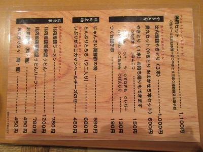 ・横手プラザホテルとアネックスの間にある駐車場に作られた比較的小さな居酒屋で,カウンター席が主です.有名な横手やきそばを出す居酒屋が定休日で閉まっていたので,ここに立ち寄ってみました.料金的にはチョット高めかなという気がしますが,比内地鶏のメニューが沢山あり,ラーメン(780円)もあるので,試しに食べてみるのには調度良かったです.横手を中心とする秋田の地酒も沢山置いてあり,こちらの価格はどれも良心的でした.