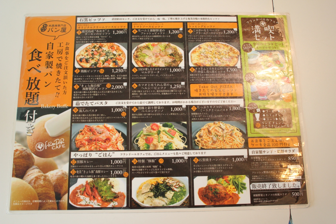 奄美大島の笠利海岸に面したレストラン併設のパン屋さんです.地元でも人気らしく,結構混んでいました.晴れていればテラスに出て綺麗な海を見ながら食事することも出来ます.昼食メニュー(ピザ,パスタ1000円~)を頼むと,自家製のパン(種類は限られています)を自由に食べることが出来ます.また,パスタやピザ以外にも黒豚カレー,豚飯,ハンバーグもありました.