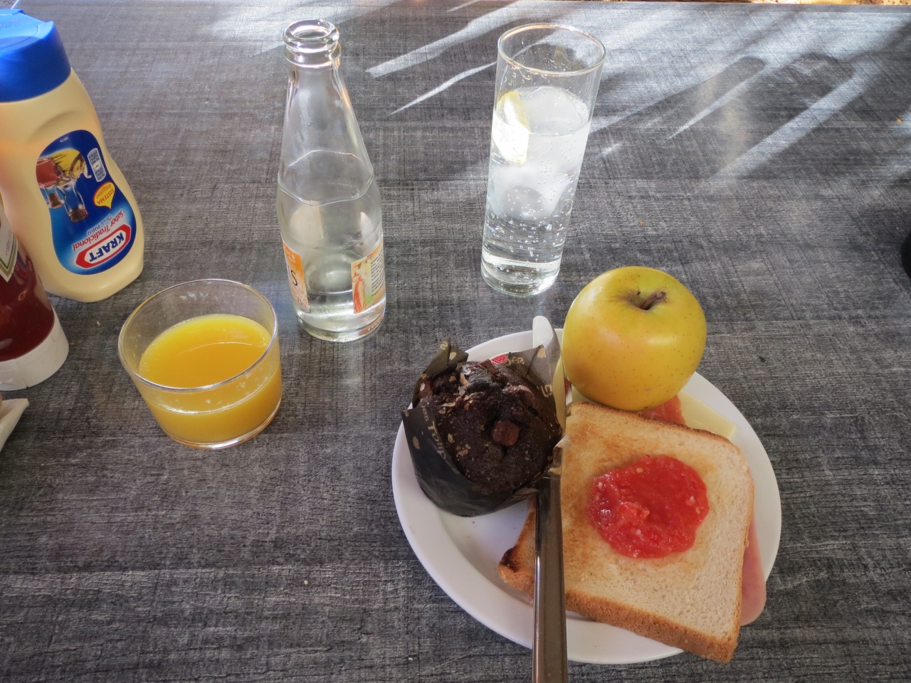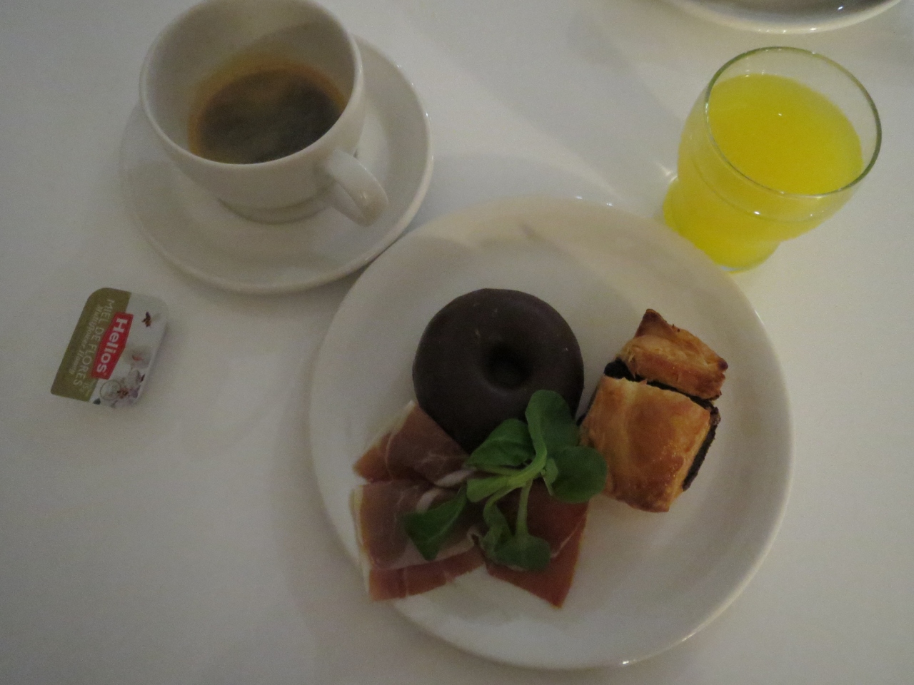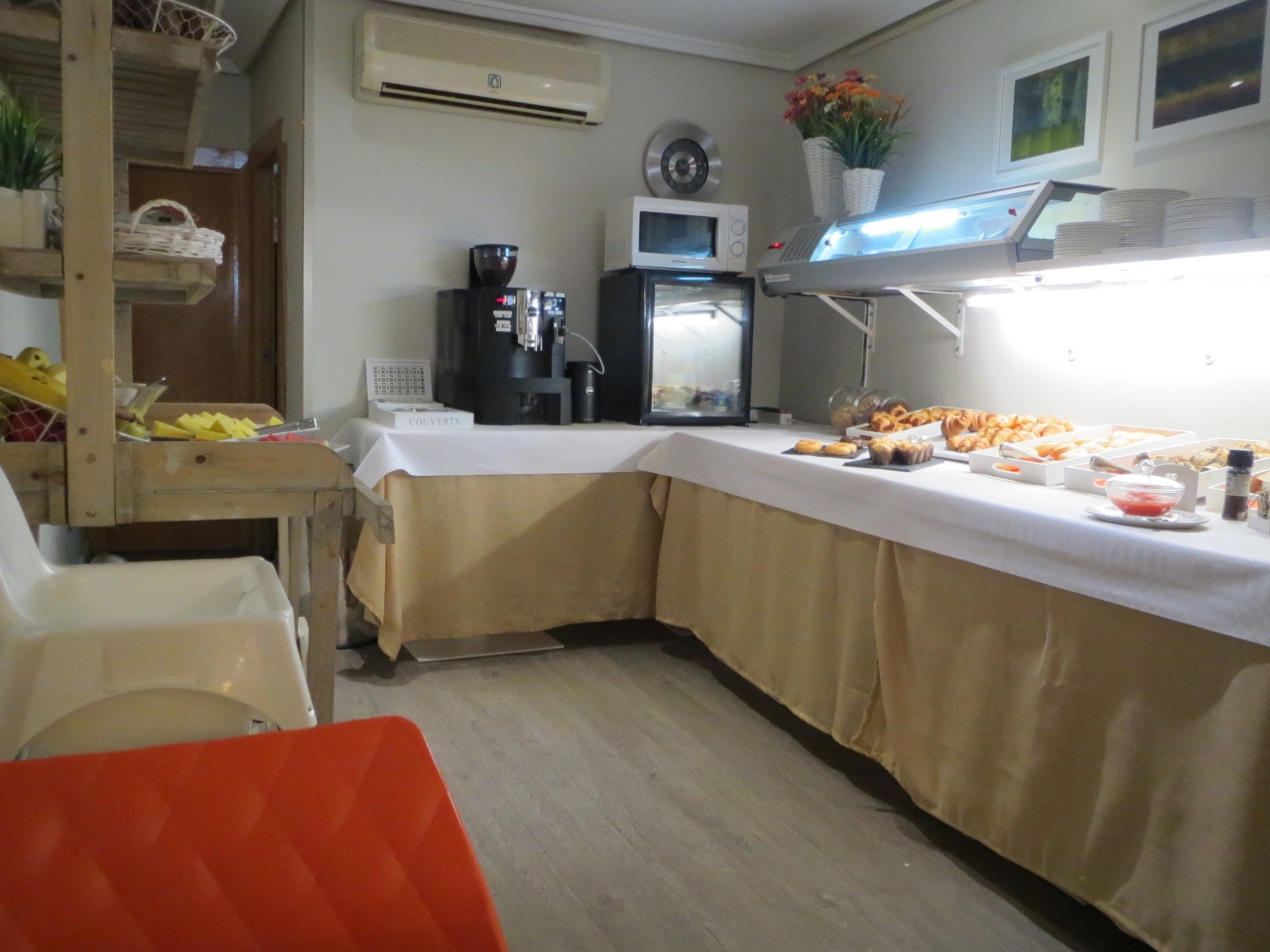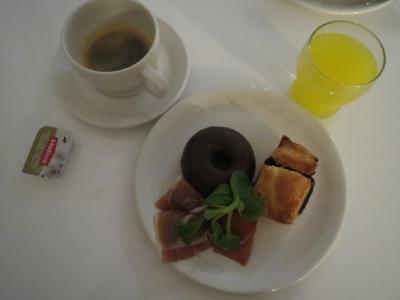 朝食は1Fのレストランで.朝7時から食べられます.パン,菓子パン,ハム,チーズ,オレンジジュース,果物(リンゴ,洋なし)のシンプルな物です.コーヒーは直接頼めばその場で入れてくれます(エスプレッソ,アメリカン等を指定可).水もガス入りが欲しい場合は,頼めば貰えます.