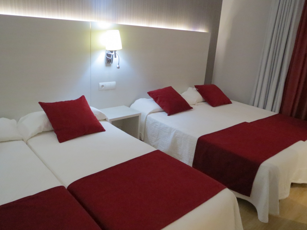 6月でまだシーズンオフということもあるせいか,1泊朝食付きで38ユーロでした.シングル利用でしたが部屋にはシングルベッドが2つにダブルベッドが1つ置いてあり,その分生活空間が狭くなっていますが,グループで利用した場合には非常にエコノミーになります.