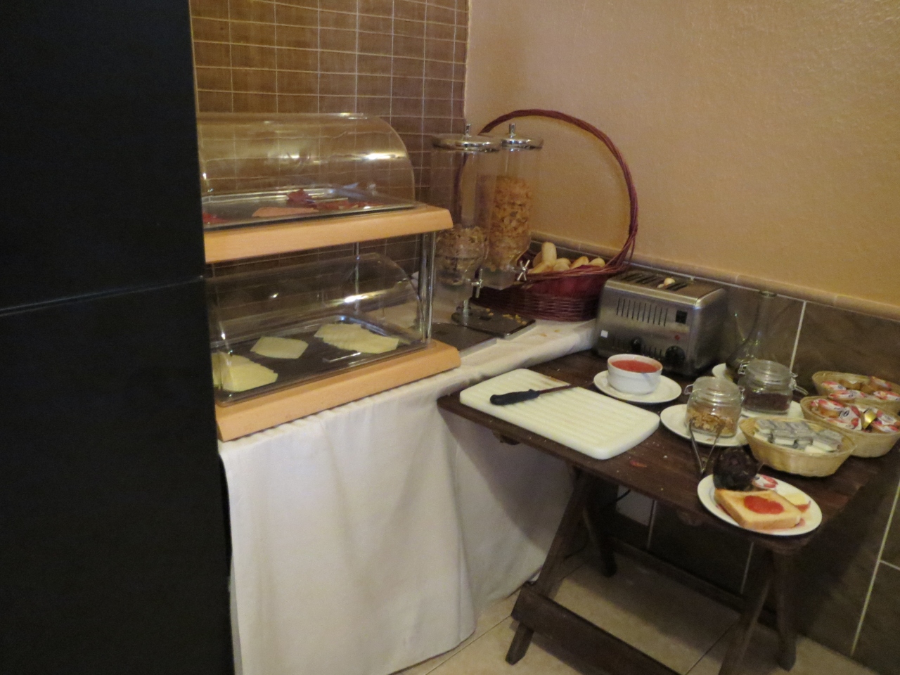 朝食は7時~で,各種パン,菓子パン,ジュース,ゆで卵,ハム,チーズ,コーヒー,果物などが主なメニューです.朝食は結構美味しかったですが,野菜類は基本的にありません(野菜と言えるかどうか,細かく刻んだトマトが唯一野菜のようなメニューでした).コーヒーはコーヒーメーカーから自分で入れるタイプですが,ネスカフェと書いてありました.