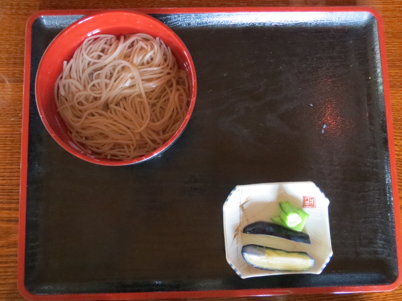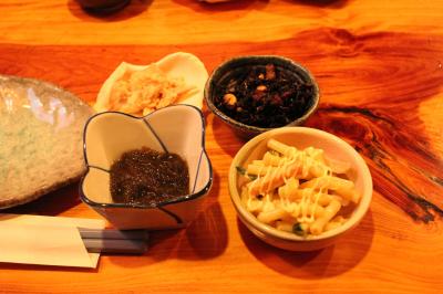 お蕎麦を注文すると,最初に自家製のこんにゃくが出来てきます.食べ放題以外のメニューはもりそば1000円,水そば500円です.もりそばはタケノコとガンモの煮付け,ワラビとコンニャクの酢味噌和え,キュウリとナスの漬物が付きました.
