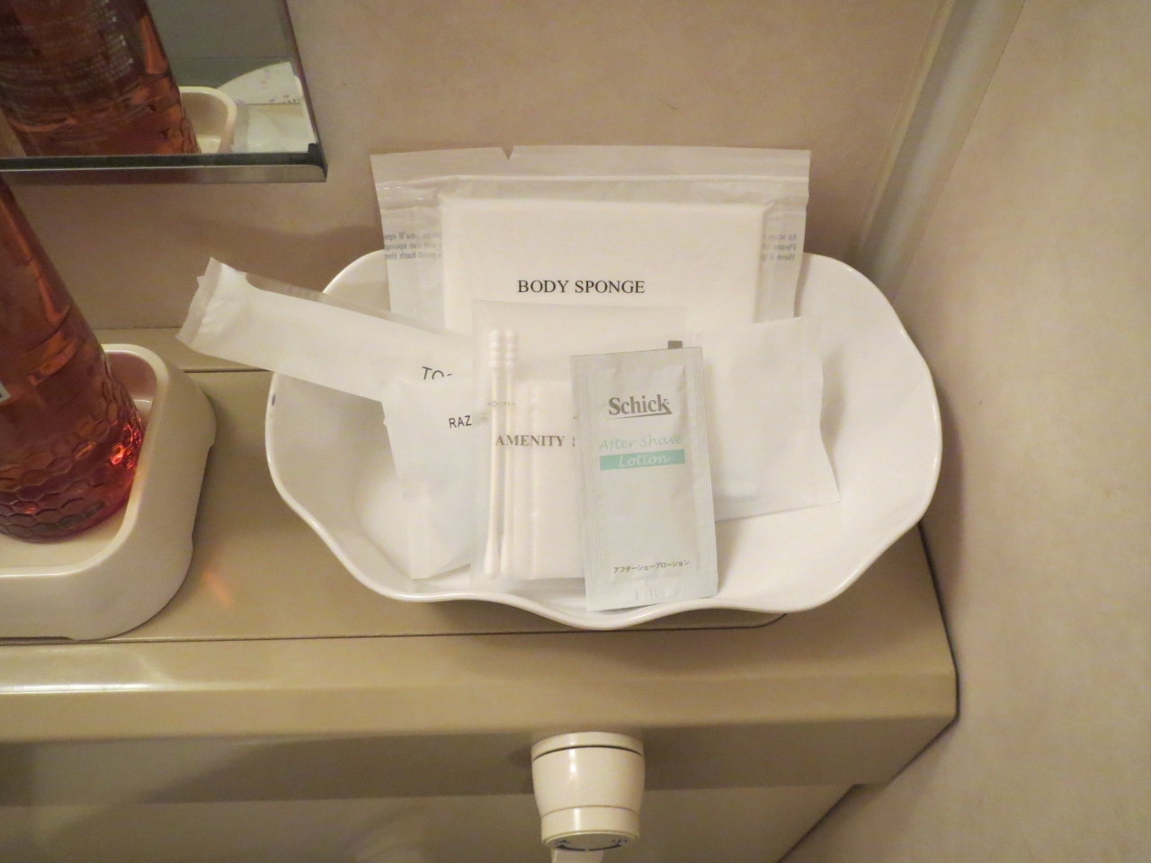 髭剃り、スポンジ、綿棒、歯ブラシ。質は普通です。櫛はありませんでした。室内にはお茶パックが2つありました。