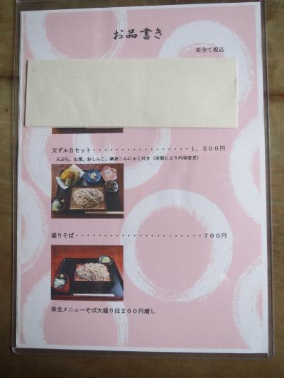 HPには天ざるA,Bセットがあることになっていましたが,私が行ったときにはAセットは消されていて,1,500円のBセットのみでした.その他は盛りそば700円.キュウリの漬物しか付いていないので,別途天ぷら500円を注文しました.天ぷらの中身はカボチャ,ズッキーニ,かき揚げ,烏賊ゲソ,ナタマメで,田舎っぽい揚げ方なので,好き嫌いは人それぞれだと思います.