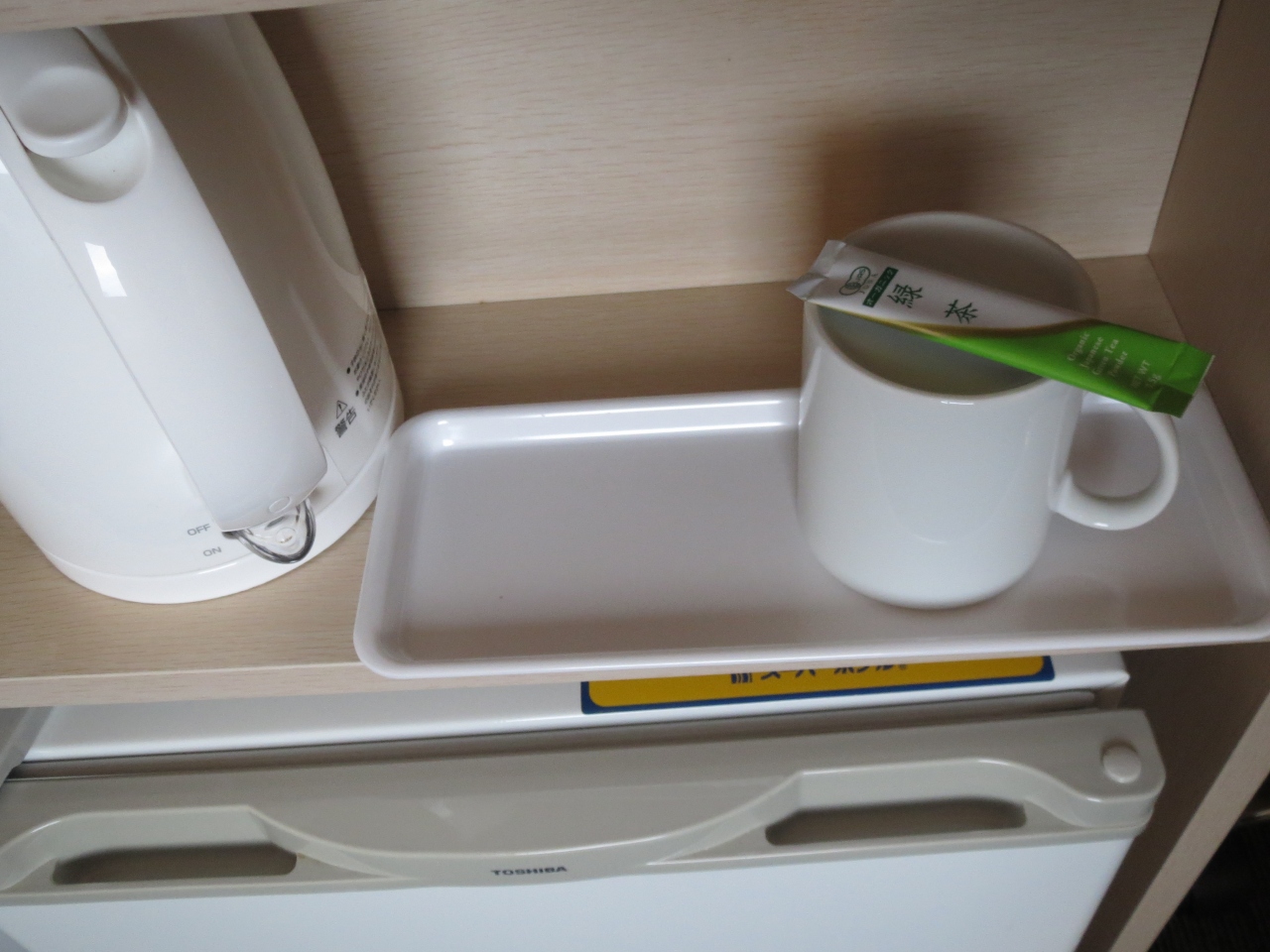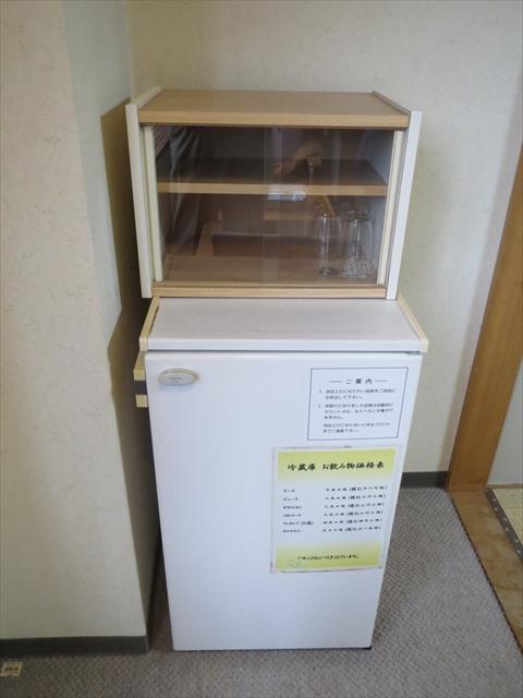 湯沸かし器はありません。冷蔵庫は小型のものが一つ。中に有料の飲み物が入っています。