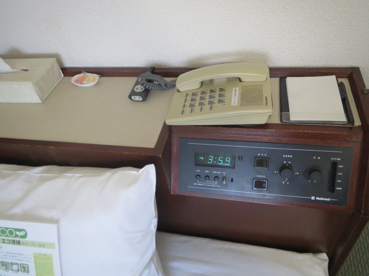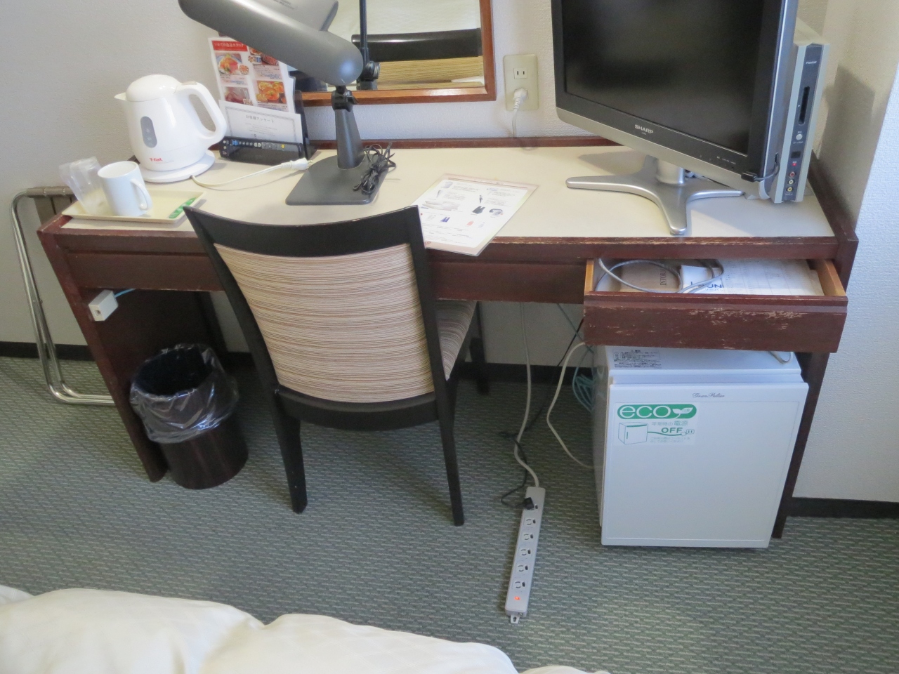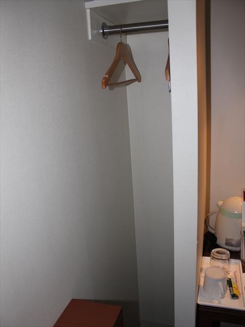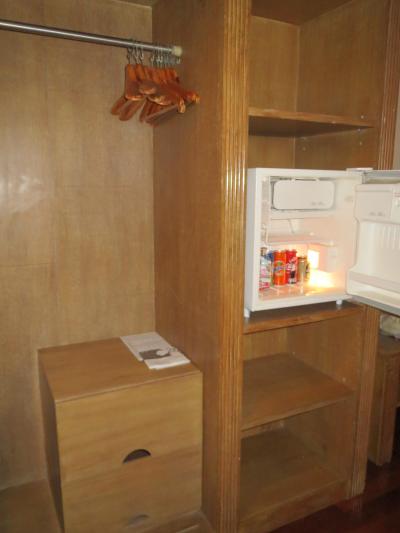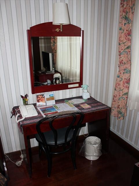 ベッドとベッドの間にあるテーブルが鏡台とデスクを兼ねています.デスクの上には電話,電気ポット,ティッシュなどが乗っており,デスク自体もスゴク小さいので,ここでPCを広げるのは事実上無理だと思います.