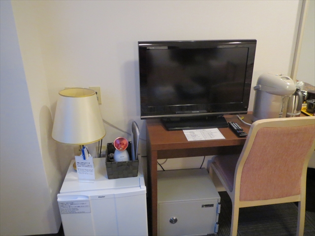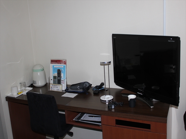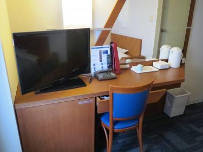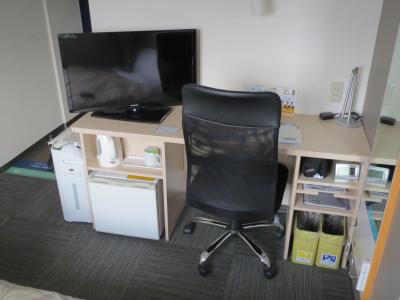 小さめのデスク一つ。椅子は背もたれ付きで使いやすいですが、テレビが見られないので残念です。