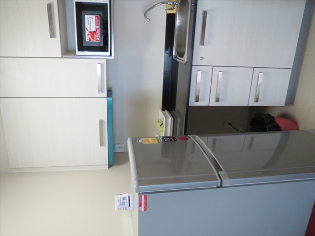 電子レンジ、湯沸かし器、大型冷蔵庫、流しが付いており、長期滞在にも対応しています。ソファは大き目で、寝転んでテレビが見えます。