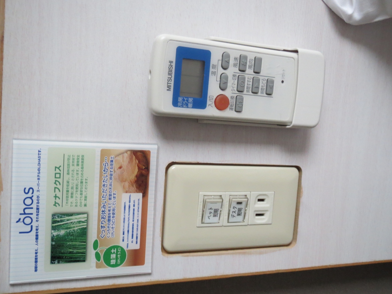 デスクには6連絡タップが、ベッド脇には2連タップがあり、非常に便利です。エアコンは3段階方式でやや残念。