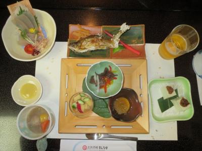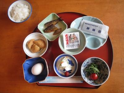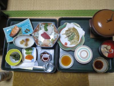 夕食は部屋食にして頂きました.量は決して多いとは言えませんが,地物の山菜類など,心のこもった物を出して頂きました.朝食はビュッフェ形式ではなく,お膳に載せた物が出てきます.鮎の甘露煮が出ていました.