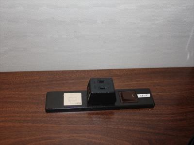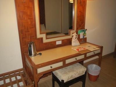 デスクは鏡台と兼ねています。コンセントが二つ付いているので便利です。220Vですが、日本のコンセントタイプが使えます。