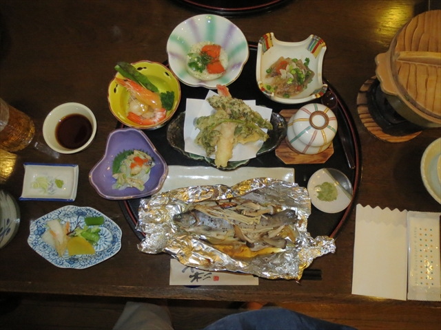 夕食:イワナの塩焼き,天ぷら,蕎麦など.もう少し山のものを期待していたのですが,意外と「海のもの」がテーブルに載ったのでチョット驚きました.