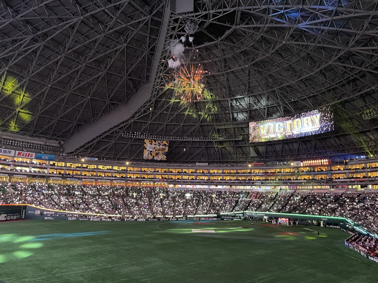 スクリーンはとても大きく、きれいでした。ホークス勝利の後はドーム内なのに花火もあり、爆音にビビりました。