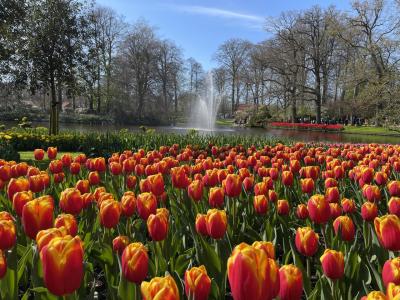ちょうど満開の頃、アムステルダム市内からキューケンホフに行くのに、バスとチケットがセットになったものを公式サイトから購入しました。地下鉄のEuropaplein駅を降りたら直ぐに乗り口があり、12:00過ぎに到着しましたが、混雑していました。係員にQRコードを読み込んでもらって並びます。