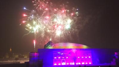 規模は違いますが、札幌と同じような雪や氷のオブジェがたくさんあります。夜にはライトアップされて、メイン会場ではプロジェクションマッピングや花火もあり、見応えがありました。花火は中央の少し上の方から見ましたが、よく見えました。見ている間、とても寒かったので防寒が必要です。