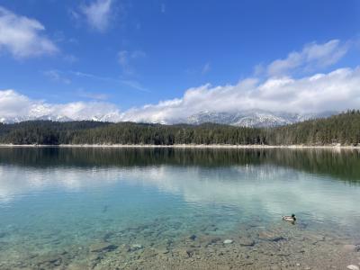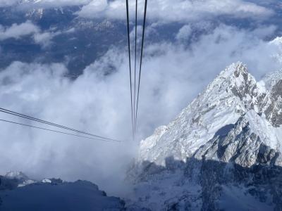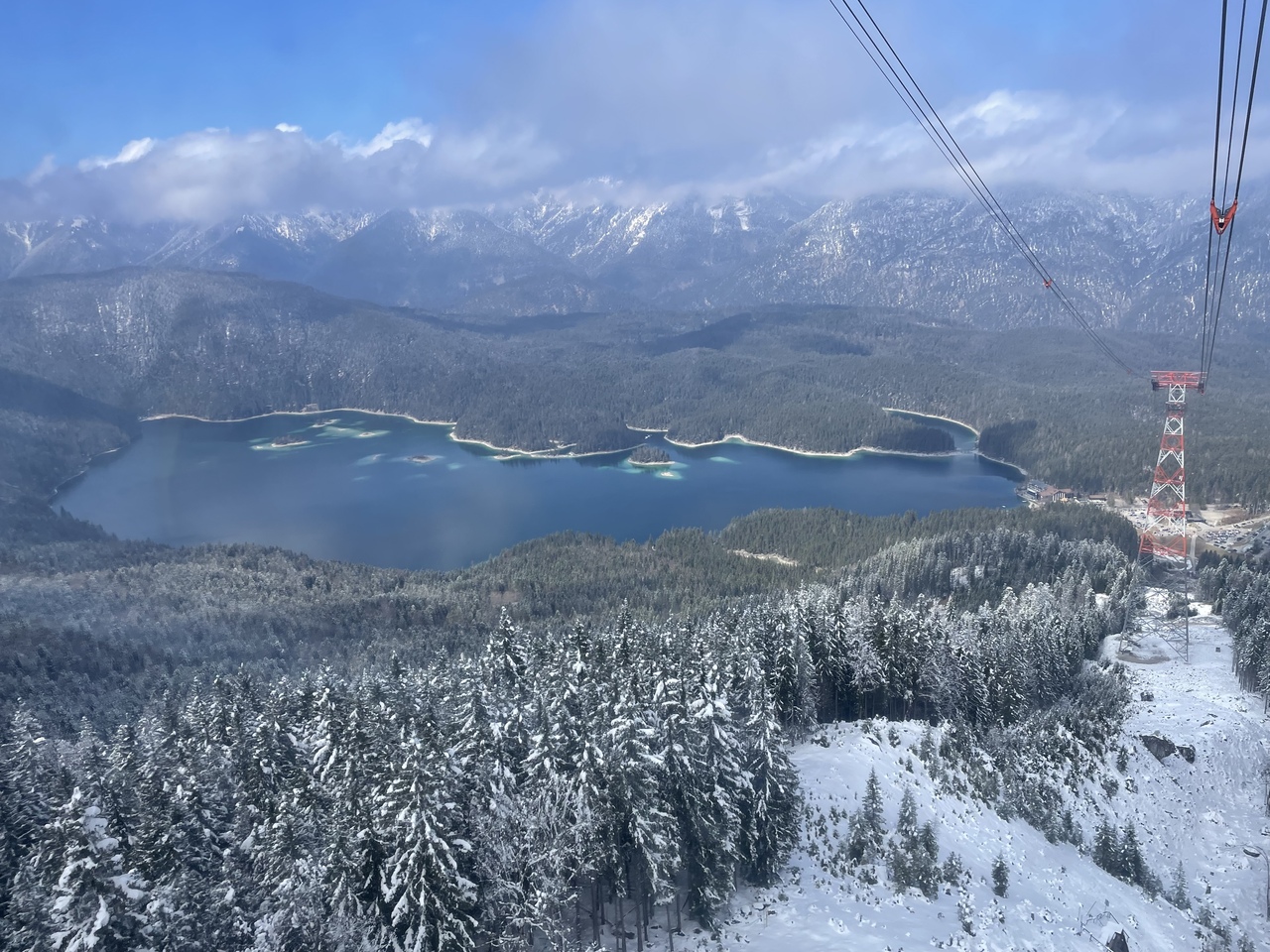 ツークシュピッツェの展望台からは雲があり全景が見えませんでしたが、ロープウェイから美しい全景が見えました。登山鉄道からも一瞬みえ、雪景色の中のアイプゼーに歓声があがりました。