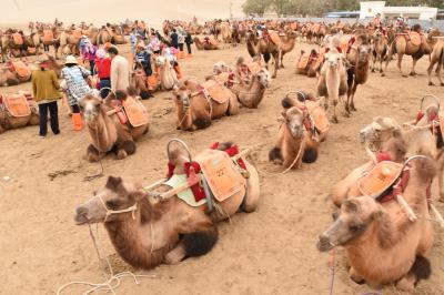 ツアーで行きました。まず目に飛び込んでくるのはラクダの大渋滞です。延々と続くラクダの列。ツアーには組み込まれていなかったのですが、乗ってみました。乗りごごちは悪くないのですが、とにかく観光客の数が多すぎて、全く趣がありません。しかも綱を引いている人が写真を取ってやるというのでカメラを渡すと、もう法外なチップを要求されとても嫌な思いをしました。ラクダを降りてから砂山を登ったりしたのですが、大量の中国人観光客が大はしゃぎしていて(中国なのでこちらが文句を言う筋合いではないのですが)シルクロードのロマンとはかけ離れた、とってもとっても俗っぽいところでした。