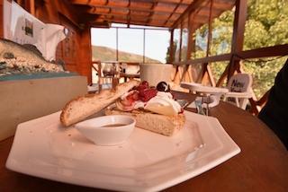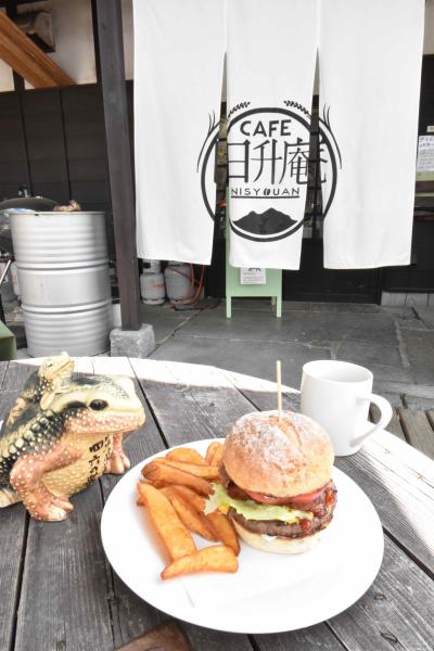 筑波山のバス停近くにあるハンバーガー屋さん。一番安いメニューでも1200円(ポテトなし)。これにポテトと飲み物をつけると一人2000円ほどになります。味はそこそこですが、価格が高いので当然ともいえます。外席はペット可ですが、道路に近くうるさいです。椅子も座りにくく、ペットに優しいとは言えません。