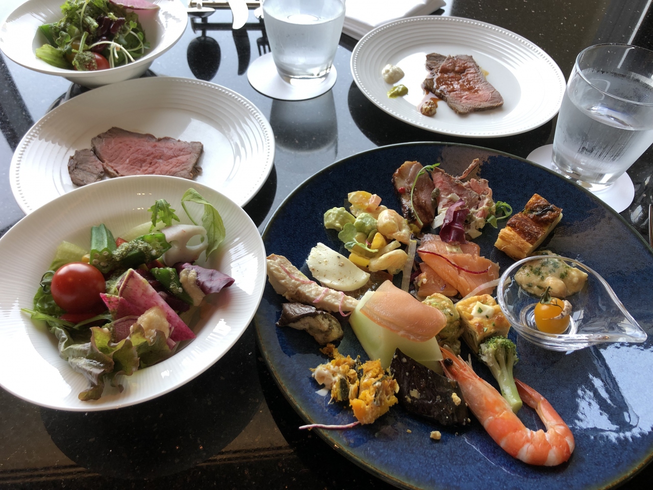 イタリアンランチブッフェで、パスタ、ローストビーフ、チーズ類、野菜やお肉、魚介を使ったお料理など、色々種類があり、楽しめました。カニもありました。