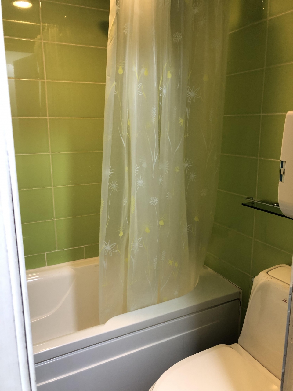 バスルームは、浴槽&シャワーカーテンがあるので快適でした。無いとこ多いので高ポイントです。シャンプー、コンディショナー、ボディソープ有り。