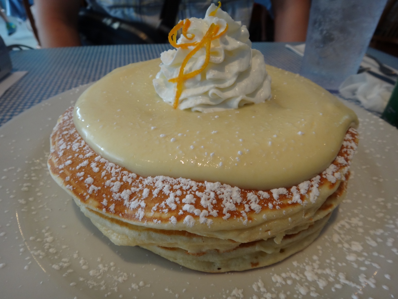 ◆注文の品:グァバ シフォン パンケーキ2枚$8.50、エッグベネディクト(トラディッショナル)$13.95、オレンジジュース、レモネード