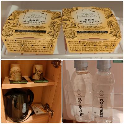 部屋:冷蔵庫、金庫、ポット、ティーバッグ等、無料のお水2本、スリッパ