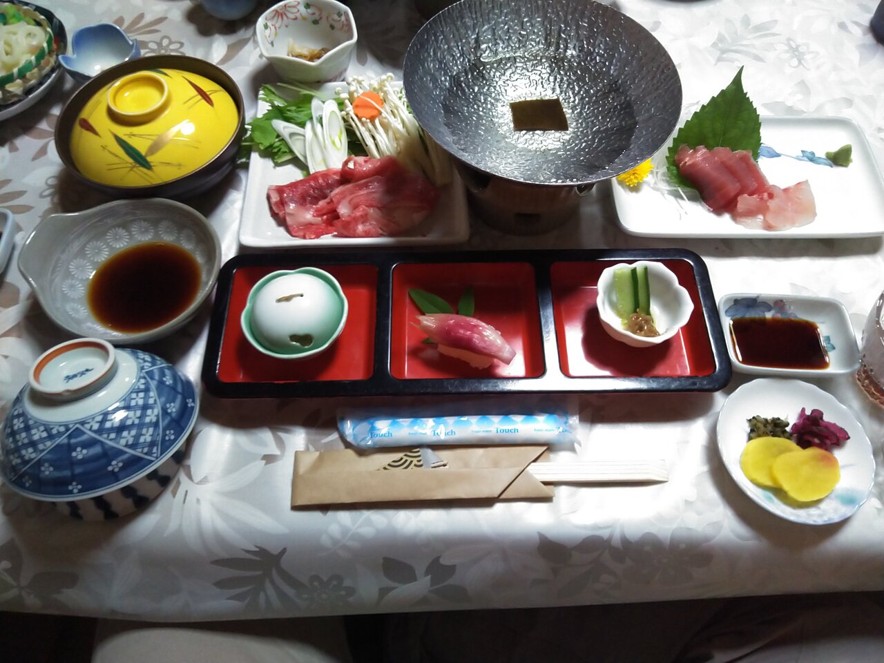 夕食はこれでもかとおかずが出てきます。茗荷のお寿司も鮎の天麩羅も美味しい!