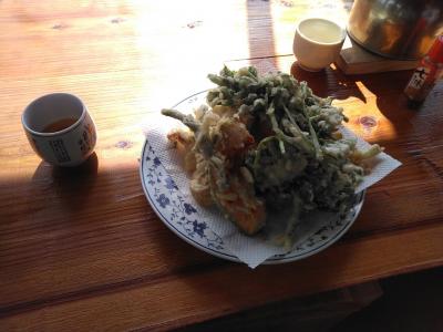 天麩羅は店の横でセリを摘んであげていました。ただし、とてもボリュームがあるので、二人でも一人前で十分です。天麩羅につけるものは塩しかないので、自宅から抹茶塩とかを持っていくのがおすすめ。かけそばのお出汁につけても美味しい。- 旅行時期